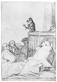 - Explicación de esta estampa del manuscrito del Museo del Prado: Esto tiene trazas de junta académica. ¿ quién sabe si el papagayo estará hablando de medicina pero no hay que creerlo sobre su palabra. Médico hay que cuando habla es un pico de oro y cuando receta un Herodes: discurre perfectamente de las dolencias y no las cura: emboba a los enfermos y atesta los cementerios de calaberas.[2]