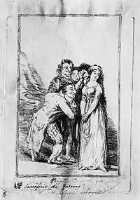 En el dibujo preparatorio a pluma con tinta sepia del Museo del Prado las expresiones son más graves, por lo que se han suavizado algo en el grabado. Al pie del dibujo está escrito un texto casi ilegible: Son señoritos a cual más rico; y la pobre no sabe a cual escoger. Parece, pues, que en el dibujo los personajes de fondo no representan la familia de la novia sino pretendientes ricos formando un coro de deformes enamorados. Sobre las letras casi borradas hay superpuesta una leyenda más remarcada que reza: Sacrificio de interés.[4]