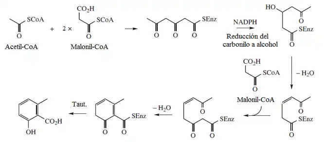 El ácido 6-metilsalicílico se biosintetiza a partir de un ácido triacético, el cual se reduce en el segundo grupo ceto hasta alqueno. Posteriormente se efectúa una segunda condensación de Claisen con una unidad de malonil coenzima A. El producto final cicliza por medio de una condensación aldólica y se forma el tautómero enol, el cual es más estable por aromaticidad.[7] Todo este procedimiento es efectuado por la enzima 6-metilsalicilato sintasa (EC 2.3.1.165)[8]
