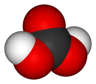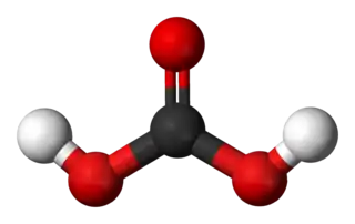 El ácido carbónico es un ácido oxácido proveniente del dióxido de carbono (CO2), siendo su composición H2CO3.[2] También es llamado trioxicarbonato de dihidrogeno (trioxidocarbonato), trioxocarbonato (IV) de hidrógeno o ácido trioxocarbónico (IV). Es un ácido débil pues su constante de ionización es muy pequeña, Ka = 4,5·10-7.[3] El ácido carbónico puede atacar a muchos de los minerales que comúnmente forman las rocas calizas o margosas, descomponiéndolos por ejemplo en bicarbonato de calcio.[4]
