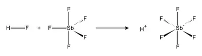 La reacción de fluoruro de hidrógeno (HF) y SbF5 es exotérmica. HF libera el catión (H+), y su base conjugada (F−) es secuestrada por una o más moléculas de SbF5 para producir SbF6− octaédrico. Este anión se clasifica como no coordinante, porque es tanto un nucleófilo débil y una base muy débil. El catión H+ permanece efectivamente «desnudo», lo que trae como consecuencia la extrema acidez del sistema. El ácido fluoroantimónico es 2×1019 veces más fuerte que el ácido sulfúrico. La reacción del fluoruro de hidrógeno y pentafluoruro de antimonio procede como sigue: