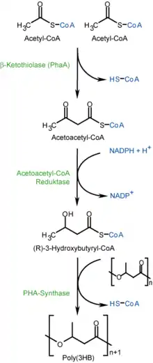 El PHB se produce en la naturaleza de manera natural por microorganismos (tales como Ralstonia metallidurans o Bacillus megaterium) aparentemente en respuesta a condiciones de estrés fisiológico; principalmente condiciones en las que los nutrientes son limitados. El polímero es principalmente un producto de asimilación de carbono (a partir de glucosa o almidón) y se emplea por estos microorganismos como una forma de almacenamiento de energía para ser metabolizados cuando otras fuentes de energía comunes no están disponibles. La biosíntesis microbiana de PHB comienza con la condensación de dos moléculas de acetil-CoA para dar acetoacetil-CoA que se reduce posteriormente a 3-hidroxibutiril-CoA. Este último compuesto se utiliza a continuación como un monómero para la polimerización del PHB.[3] Los gránulos de PHB se recuperan entonces a partir de las células.[4]