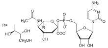El ácido siálico o ácido N-acetilneuramínico es un monosacárido ácido derivado del ácido neuramínico (un compuesto base de 8 átomos de carbono) mediante acetilación. Es un componente importante de las glucoproteínas. Se sintetiza a partir de la glucosamina 6 fosfato con acetil-CoA por una transferasa dando -N- acetilglucosamina 6P de ahí mediante la epimerización de la -N-acetilglucosamina 6 fosfato en N-acetilmanosamina-6-fosfato. Este último compuesto reacciona con el fosfoenolpiruvato para dar lugar al -N- acetilneuraminico 9 P (ácido siálico), que, para poder entrar en la ruta de biosíntesis de oligosacáridos en la célula ha de activarse mediante la adición de un nucleósido monofosfato, proporcionado por la citidina trifosfato, lo que da lugar a la «citidina monofosfato-ácido siálico» (CMP-ácido siálico). Una cuestión importante de esta reacción es que el CMP-ácido siálico se sintetiza en el núcleo celular de las células animales, mientras que el resto de azúcares ligados a nucleósidos lo hacen el citosol.[1]