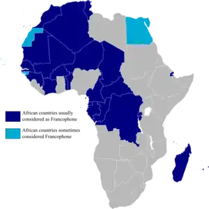 Se conoce cómo África francófona aquellos países africanos en el que el francés es lengua vehicular o cooficial. Según datos de 2020, se estima que 450 millones de personas hablan francés en 32 países francófonos de África.[2] Entre los informes se incluyen aquellos que tienen el francés como lengua nativa o segunda, sin embargo no están incluidos los francoparlantes que residen en otro país del continente donde no se habla el idioma.[2] El idioma llegó a África como consecuencia del colonialismo francés y belga.