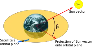 El ángulo beta (β) es una medida que se utiliza principalmente en los vuelos espaciales orbitales. El ángulo beta determina el porcentaje de tiempo que un satélite en órbita terrestre baja (LEO) pasa bajo la luz solar directa, absorbiendo energía solar.[1] El término se define como el ángulo entre el plano orbital del satélite y el vector hacia el Sol (es decir, la dirección desde la que brilla el Sol).[2] El ángulo beta es el menor de los dos ángulos entre el vector del Sol y el plano de la órbita del objeto. El ángulo beta no define un plano orbital único; todos los satélites en órbita con un ángulo beta dado a una altitud dada tienen la misma exposición al Sol, a pesar de que puedan estar orbitando en planos completamente diferentes alrededor de la Tierra.[3]