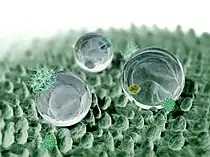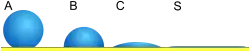 Consideremos un líquido que ha caído sobre una superficie sólida. Si el líquido es atraído fuertemente por la superficie sólida (por ejemplo agua sobre un sólido hidrófilo) la gota se extenderá completamente por el sólido y el ángulo de contacto será aproximadamente 0°. Para los sólidos que sean menos hidrófilos el ángulo de contacto puede variar entre 0° y 30°. Si la superficie del sólido es hidrófoba el ángulo de contacto será mayor que 90°. En superficies muy hidrófobas el ángulo puede ser mayor a 150° e incluso cercano a 180°. En estos casos el agua reposa sobre la superficie pero no la moja ni tampoco se extiende sobre ella. A algunas de estas superficies se les llama superhidrófobas y pueden obtenerse a partir de superficies fluoradas como el teflón que tiene una microtextura apropiada para ello. Este fenómeno se denomina «efecto loto» debido a los lotos, plantas con hojas que desarrollan esta habilidad mediante pequeñas protuberancias y que pueden ser superhidrófobas incluso con miel.