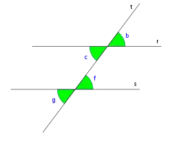 Los ángulos entre rectas paralelas y una secante, en geometría euclidiana, son los ocho ángulos formados por dos rectas paralelas (r y s en la imagen de la derecha) y una transversal a ellas (t).
