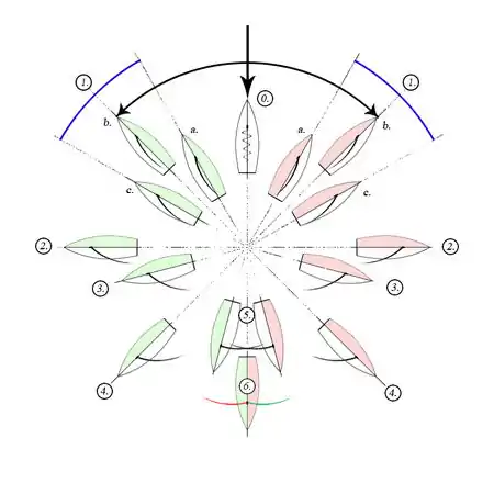 Para indicar la dirección del viento respecto al eje longitudinal de la embarcación se desarrolló un sistema convencional que divide el ángulo entre proa y popa del barco (que corresponde a 180 º) en 16 cuartas, que corresponden a 11 ° 15 'cada una.[2]