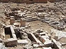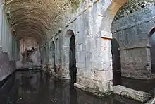 Los edificios más imponentes visibles son las cisternas. Datan de la época romana, y no se excluye que las más antiguas sean de la época helenística. La principal cisterna, llamada 'gamma' (Γ) a causa de su forma, mide 55,8 m de largo y 25 m de ancho y tiene una capacidad de 3050 m³ de agua. El techo, desaparecido, fue originalmente abovedado. Las paredes están reforzadas en el interior por una pared de ladrillos y argamasa. La estanqueidad está garantizada por una gruesa capa de yeso impermeable. Debido a la longitud de la construcción se ha añadido un muro de contención para ayudar a las paredes a soportar el peso del techo y la presión del agua. Se colocó una escalera que permite acceder a la cisterna para su mantenimiento. El conducto de evacuación no está a nivel del suelo, sino ligeramente superior, de modo que las impurezas presentes en el agua que no llegaran a los estándares de agua potable queden depositadas sobre el fondo del depósito.[21]
