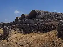 Pashley pudo localizar varios túmulos con facilidad y describe dos: el primero fue construido para dar cabida a tres cuerpos y los segundos cuatro cadáveres.[36] Las tumbas más antiguas, que acreditan la fecha de fundación de la ciudad, se remontan al periodo geométrico en el siglo VIII a. C. Los muertos se colocaban generalmente dentro de un gran phitos, en una tumba excavada en la roca. Al lado del pithos se depositaban las ofrendas, por lo general piezas de cerámica bastante simples. En períodos posteriores, entre el los siglo VII y I a. C., el tipo más común de tumba era rectangular, excavada en roca blanda y cubierta con un bloque de piedra. También hay tumbas con paredes y techo construidos con bloques espesos de piedra (cistas). Hay un tercer tipo de tumba, más simple, que consiste en tejas juntas tapando todo el cuerpo. Este último tipo fue utilizado por las familias más modestas.[10][34]