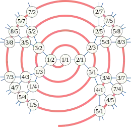 - La descripción aquí es dual a la definición original de Calkin y Wilf, que comienza definiendo la relación hijo y deduce la relación padre como parte de una prueba de que todo racional aparece una vez en el árbol. Como se define aquí, todo racional aparece una vez por definición y, en cambio, el hecho de que la estructura resultante sea un árbol requiere una prueba.