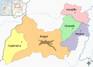 El área metropolitana de Ibagué es propuesta integrada por su municipio principal Ibagué, y los municipios aledaños a esta Cajamarca, Alvarado, Venadillo y Piedras,[2] pertenecientes todos al departamento del Tolima. Su núcleo político y económico es también el municipio de Ibagué.