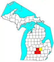 ![]() Mapa de Míchigan con el Área Estadística Metropolitana Combianda de Lansing-East Lansing-Owosso CSA y sus componentes: