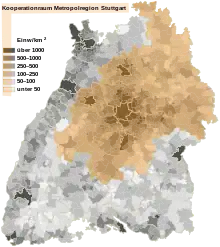 En total, el área metropolitana de Stuttgart se extiende por una superficie de 1334 km² y cuenta con una población de 1,75 millones de habitantes, de los cuales 15,5 y 34% corresponden a la ciudad de Stuttgart, respectivamente. Tiene una densidad de población de 1309 hab/km².