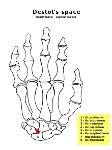 " Espacio de Destot ", también conocido como "brecha de Destot": un espacio en la muñeca delimitado por los huesos ganchoso, grande, piramidal y semilunar .