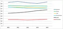 Índices de Grubel-Lloyd de varios países, según la Parte 7 de SITC Rev.4, en series temporales de 5 años.