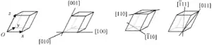 Para determinar los índices de una dirección cristalográfica cualquiera, se traza por el origen una paralela a esta. Sobre ella se toma el nudo (A) arbitrario de coordenadas (x, y, z), tal que sea múltiplo de las aristas (a, b, c) del cubo: