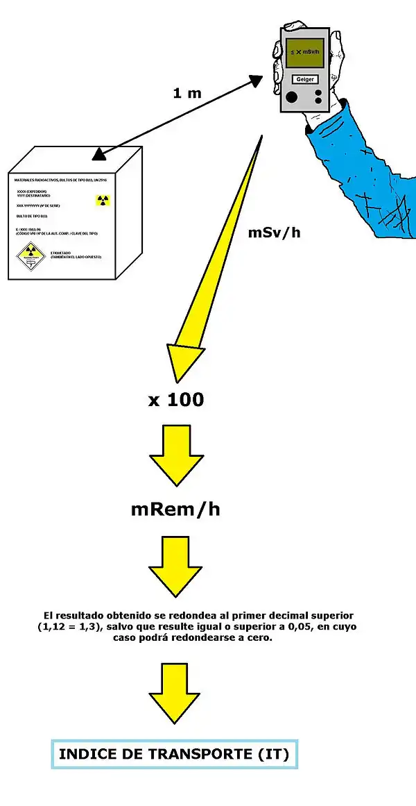 Situándonos a una distancia de un metro de la superficie externa del bulto, se mide la intensidad de la radiación máxima (mSv/h). El resultado obtenido se multiplicará por 100 y se redondeará al primer decimal superior (1.13=1.2), salvo que resulte igual o superior a 0.05, en cuyo caso podrá redondearse a cero. Este es el índice de transporte IT (TI).