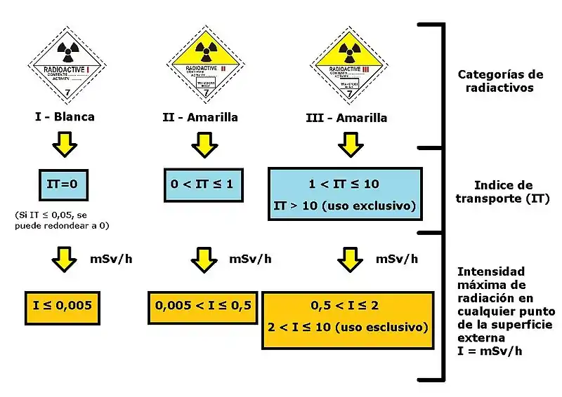 Las materias radiactivas en bultos y sobrembalajes se clasifican en 3 categorías en función del índice de transporte y de la intensidad de la radiación en la superficie: