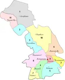 Comprende la capital provincial Astracán (directamente subordinada a la óblast como ókrug urbano) y once raiones o distritos municipales:[1][2]