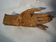 - Falta el antebrazo izquierdo. La mano izquierda, también momificada, se encuentra separada por completo del brazo por fractura del cúbito y radio a nivel de la muñeca.