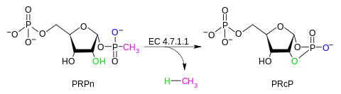 Por lo tanto, el sustrato de esta enzima es la α-D-ribosa 1-metilfosfonato 5-fosfato (PRPn), mientras que sus dos productos son α-D-ribosa 1,2-fosfato cíclico 5-fosfato (PRcP) y metano.