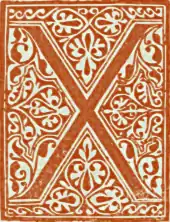 | Unicode | 935 | U+03A7 | 967 | U+03C7 | 7521 | U+1D61 | 7530 | U+1D6A | 9767 | U+2627 |