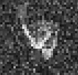 ![]() Imagen de radar de Goldstone que muestra los dos lóbulos del presunto binario de contacto RD32 de 1999. | ||