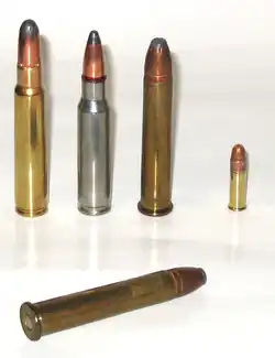 ![]() Foreground: .375 Winchester. Left to right: 8mm Mauser, .308 Winchester, .375 Winchester, .22 Long Rifle. | ||||||||||||||||||||||