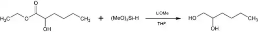 El 1,2-hexanodiol puede sintetizarse por reducción de 2-hidroxicaproato de etilo con trimetoxisilano, proceso catalizado por metóxido de litio,[7] siendo el rendimiento del 99%:[8]