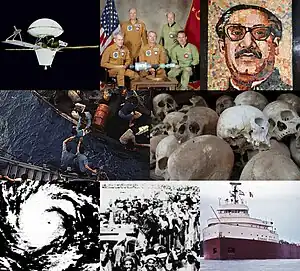 En el sentido de las agujas del reloj desde la parte superior izquierda: se lanza la sonda espacial Viking 1; se realiza Apollo-Soyuz, la primera misión espacial internacional tripulada; Sheikh Mujibur Rahman es asesinado por el ejército de Bangladesh; los Jemeres Rojos llevaron a cabo un genocidio en Camboya, matando a casi dos millones de personas; el SS Edmund Fitzgerald se hunde en el lago Superior sin supervivientes; Marcha Verde marroquí para anexionarse el Sahara Occidental; el tifón Nina mata a 229.000 personas en Taiwán y China; la caída de Saigón marcó el final de la Guerra de Vietnam.
