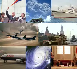 En el sentido de las agujas del reloj desde la parte superior izquierda: Boris Yeltsin, elegido como el primer presidente de Rusia, ondea la nueva bandera de Rusia después del intento de golpe de Estado en la Unión Soviética, orquestado por la línea dura soviética; El Monte Pinatubo entra en erupción en Filipinas, lo que la convierte en la segunda erupción volcánica más grande del siglo XX; El MTS Oceanos se hunde frente a la costa de Sudáfrica, pero la tripulación abandona notoriamente el barco antes de que los pasajeros sean rescatados; Disolución de la Unión Soviética: La bandera soviética se baja del Kremlin por última vez y se reemplaza con la bandera de la Federación Rusa; Los Estados Unidos y la Unión Soviética que pronto será disuelta firman el Tratado START I; Un ciclón tropical azota Bangladés, matando a casi 140.000 personas; El vuelo 004 de Lauda Air se estrella después de que uno de sus inversores de empuje se activa durante el vuelo; Una coalición liderada por Estados Unidos inicia la Operación Tormenta del Desierto para sacar a Irak y a Saddam Hussein de Kuwait.