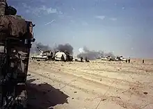 La 3.ª brigada de la división, con base en Alemania, se desplegó en Arabia Saudita en el otoño de 1990 y actuó como la tercera brigada de maniobras de la 1.ª División de Infantería desde Fort Riley, KS. Uno de los batallones de la brigada, la Fuerza de Tarea 1-41 de Infantería, fue la primera fuerza de la coalición en cruzar la frontera de Arabia Saudita el 15 de febrero de 1991 y llevar a cabo operaciones de combate terrestre en Irak participando en combates de fuego directos e indirectos con el enemigo el 17 de febrero de 1991.[20] Praticipo en la batalla de seis horas para despejar las posiciones defensivas iniciales de Irak.[20] Inicialmente se le encomendó realizar misiones de contra reconocimiento y reconocimiento contra las unidades de reconocimiento iraquíes.[21] La brigada participó en la batalla de 73 Easting con la 1.ª División de Infantería (Mecanizada) y el 2.º Regimiento de Caballería Blindada. Fueron responsables de la destrucción de la 18.ª Brigada Mecanizada y la 9.ª Brigada Blindada iraquíes de la División de Infantería Mecanizada Tawakalna de la Guardia Republicana y de la 26ª División de Infantería iraquí. Desempeñaron un papel clave en la destrucción de la 12.ª División Blindada destruyendo 80 vehículos de combate.[22] La brigada destruyó 60 tanques iraquíes y 35 vehículos de infantería a lo largo del oleoducto IPSA.[23] Esto se conoce como la Batalla de Norfolk . El batallón 4-3 FA de la división jugó un papel importante en la destrucción de 50 tanques enemigos, 139 APC, 30 sistemas de defensa aérea, 152 piezas de artillería, 27 lanzadores de misiles, 108 morteros y 548 vehículos con ruedas, 61 líneas de trincheras, posiciones de búnker, 92 objetivos de infantería atrincherados y abiertos y 34 emplazamientos logísticos durante sus operaciones de combate.[24] Antes del final de las operaciones de combate, la 2.ª División Blindada (Adelante) se enfrentaría a un total de 11 divisiones iraquíes.[25] Al amanecer del tercer día de la campaña terrestre, la 2.ª División Blindada (Avanzada) participó en la destrucción de cuatro brigadas mecanizadas y de tanques iraquíes y dos divisiones. Entre el alto el fuego y el fin oficial de la guerra en abril de 1991, la 2.ª División Blindada (Avanzada) participó en operaciones de seguridad para garantizar la paz en Kuwait. A continuación, la división se trasladó a Arabia Saudita, donde algunos de sus soldados establecieron y administraron tres campos de refugiados cerca de Raffia, Arabia Saudita. Entre el 15 de abril y el 10 de mayo, el personal de socorro de la División procesó a más de 22.000 refugiados iraquíes. Tras entregar los campos al gobierno Saudí, la unidad volvió a desplegarse en Alemania.
