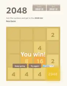 2048 es un juego en línea y para telefonía móvil creado en marzo de 2014 por el desarrollador web italiano de 19 años Gabriele Cirulli, cuyo objetivo es deslizar baldosas en una cuadrícula para combinarlas y crear una baldosa con el número 2048.[2] Se lo considera como un rompecabezas de deslizamiento, con una apariencia muy similar a la aplicación Threes! lanzada un mes antes.[3][4] Algunas aplicaciones derivadas de 2048 incluyen elementos de Doge, Doctor Who, Flappy Bird y Tetris; también existe una versión 3D[4] y otras con cuadrículas más grandes o más pequeñas.[5] Cirulli ve esto como "parte de la belleza del software de código abierto"[6] y no se opone a estas "mientras estas agreguen modificaciones nuevas y creativas al juego".[7]