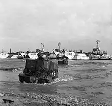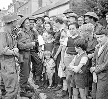 47 comandos fueron desembarcados a las 10:00, mientras los Hampshires seguían luchando por Le Hammel, tres de sus lanchas de desembarco fueron hundidas por obstáculos ocultos en la marea creciente. Dirigieron un avance de lucha hacia el interior, pero no tomaron Port-en-Bessin hasta la madrugada del 8 de junio. A las 11:00, la 151.ª Brigada comenzó a aterrizar, después de la 69.ª Brigada, la 56.ª Brigada desembarcó al este de su playa prevista para evitar el incendio desde el punto fuerte de Le Hammel. Al caer la noche, la división tenía una cabeza de playa de 6 millas (9.7 km) de profundidad por 6 millas (9.7 km) de ancho, se había establecido contacto con los canadienses, y las patrullas de la 56.ª Brigada habían ingresado a Bayeux, pero la división era menor que la del camino Bayeux-Caen.[79][80]