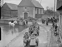 Por el momento, Arras se volvió llamativa y vulnerable a las líneas alemanas. Las cuatro brigadas de la 5.ª y 50.ª División fueron fuertemente presionadas y en la noche del 23–24 de mayo recibieron órdenes de retirada hacia la línea del canal. Después de luchar en la línea del canal, las 5.ª y 50.ª División fueron retiradas del norte a Ypres para llenar un vacío amenazante entre el Ejército belga y la BEF, después de un fuerte ataque alemán a los belgas el 25 de mayo. Ya avanzado el 27 de mayo, cuándo la 50.ª División llegó sl Ypres para encontrar sus posiciones ya bombardeadas y al Ejército belga siendo empujado hacia el noreste lejos de ella. La brecha fue cubierta al día siguiente por la 3.ª División, al mando del entonces General Mayor Bernard Montgomery. Aquel día (28 de mayo) los belgas se rindieron, abriendo una brecha de 20 millas al sur del Canal de la Mancha, que los alemanes no tardaron en aprovechar. La división fue ordenada para formar una línea al este de Poperinghe, con la 3.ª División al oriente hacia Lizerne, esto fue hecho la mañana del 29 de mayo, formando el borde del sur del corredor de Dunkerque. En contacto con los alemanes desde el inicio, la 50.ª División fue obligada a retroceder y al cerrar el 30 de mayo estaba en el borde este del perímetro de Dunkerque. La división fue reforzada por algunos remanentes de la 23ª División (Northumbria) el 31 de mayo, que fue necesario debido a que los alemanes seguían contraatacando y bombardeando las posiciones de la 50.ª División. Retirada a la playa el 1 de junio, la 151ª Brigada fue informada que sería utilizada en un ataque de despiste para cubrir la evacuación y formar dos columnas, pero esto sería innecesario. Aquella noche la 50.ª División fue evacuada de las playas (150ª Brigada, RASC y pistoleros) y el Topo (151ª Brigada y otros), habiendo sido estimado por el General Brooke que contaban con una fuerza de 2.400 hombres para el 30 de mayo.[12][13][14][15][16][17][18]