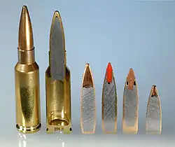 Sus defensores afirman que el Grendel es un buen "intermedio" entre el 5,56 × 45 mm OTAN y el 7,62 × 51 mm OTAN, retienendo una mayor energía terminal a distancias ampliadas que cualquiera de estos cartuchos debido a su mayor coeficiente balístico (BC).[2] Por ejemplo, el proyectil de 123 granos (8,0 g) tiene más energía cinética y mejor penetración del blindaje corporal a 1,000 metros (1.100 yd) que el 147 granos más grande y pesado bala del cartucho OTAN M80 de 7,62 mm.[11][12][13]