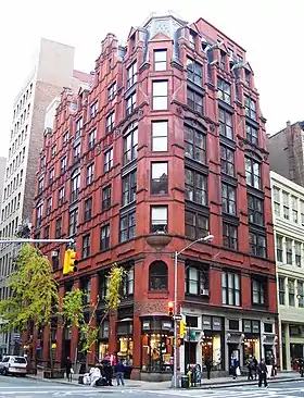 889 Broadway es un edificio de ocho pisos ubicado en la esquina noroeste de 19th Street y Broadway.[1][21] Fue diseñado por Edward Hale Kendall al estilo Reina Ana.[4] El edificio es inusual porque es uno de los relativamente pocos edificios comerciales de estilo Reina Ana en Nueva York.[16][22] Utilizado por primera vez en los Estados Unidos en los años 1860, el estilo Reina Ana incluía características como fachadas de ladrillo asimétricas, molduras decorativas de piedra, ornamentación elaborada y techos interrumpidos por buhardillas o frontones.[23]