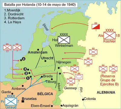 ![]() Fuerzas alemanas ingresando en Róterdam tras la rendición de los defensores holandeses. | ||