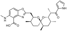 Se cree que las enzimas biosintéticas centrales incluyen 3 proteínas para la biosíntesis del resto α-cetopirrol, 5 para policétido sintasas modulares de tipo I para el anillo de espirocetal, 4 para la biosíntesis del ácido 3-hidroxiantranílico, una enzima de adaptación de N-metiltransferasa, y una tioesterasa tipo II.[6]