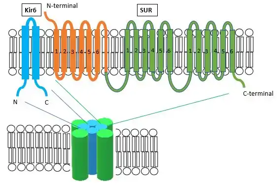 Los genes ABCC9 forman los canales de KATP canónicos. Son complejos octaméricos cuyo poro está constituido por un tetrámero de subunidades de Kir6.2, que se asocian externamente con miembros de proteínas transmembrana de transportadores ABC (ATP binding cassette), tanto ABCC8 y ABCC9, formando otro tetrámero. Las proteínas Kir6 son codificadas por los genes KCNJ8 y KCNJ11 mientras que las subunidades de ABC por los genes SUR1 y SUR2. Los genes de Kir6 y ABCC9 se sitúan en el cromosoma 12p12.1 adyacentes uno al otros. Por cristalografía se ha demostrado que las subunidades Kir6 forman hélices transmembrana con un bucle extracelular que controla el paso iónico, mientras que los miembros de la familia ABC son dominios de seis hélices transmembrana. Su dominio del extremo N-terminal constituye otras seis hélices transmembrana adicionales.[2]