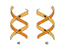 El sentido de la hélice es a derechas, esto es, cada una de las cadenas de nucleótidos gira a derechas: la hélice doble es una espiral dextrógira. Esto puede verificarse si nos fijamos, yendo de abajo arriba, en la dirección que siguen los segmentos de las hebras que quedan en primer plano. Si las dos hebras giran a derechas se dice que la hélice doble es dextrógira, y si giran a izquierdas, levógira.