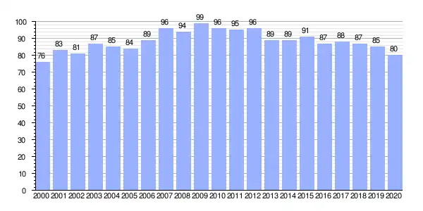 | Gráfica de evolución demográfica de A Moniña entre 2000 y 2020 |