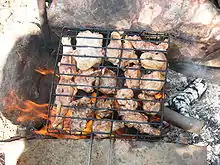 Asar a la parrilla es una forma de cocinar que consiste en aplicar calor a la superficie de los alimentos, normalmente desde arriba, desde abajo o desde un lado.[1] Asar a la parrilla suele implicar una cantidad significativa de calor directo e irradiado, y suele utilizarse para cocinar carne y verduras rápidamente. Los alimentos que se van a asar se cocinan en una parrilla (una rejilla de alambre abierta, como una plancha, con una fuente de calor por encima o por debajo), utilizando una sartén de hierro fundido o una sartén grill (similar a una sartén, pero con crestas elevadas para imitar los alambres de una parrilla abierta).
