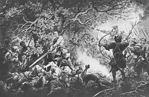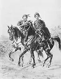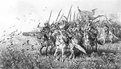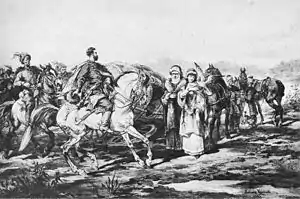 ![]() Juan Skrzetuski se encuentra con Elena Kurcewiczówna y con su tía. Obra de Juliusz Kossak | ||