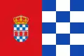 Bandera rectangular, de proporciones 2/3, compuesta por dos franjas verticales iguales, roja al asta, con el escudo heráldico municipal y ajedrezada al batiente de blanco y azul de tres por cinco órdenes[3]