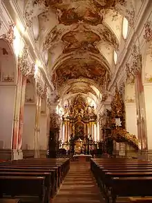 El interior presenta obras de estuco y frescos en estilo barroco tardío/rococó temprano de los miembros de la Escuela Wessobrunner. El principal pintor fue Matthäus Günther. La historia de San Benito destaca en los frescos.[1] :83