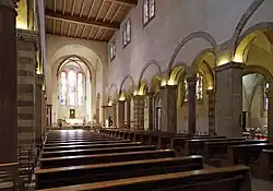 Parte de la basílica fue destruida en 1944 como consecuencia de la Segunda Guerra Mundial, los obuses destruyeron los últimos muros. Fue nuevamente reconstruida -quinta iglesia en catorce siglos- en estilo románico como fue en su origen, la fachada está inspirada en la basílica románica del Sagrado Corazón de Paray-le-Monial. El edificio, una vez reconstruido, fue consagrado en el año 1953. La cripta del siglo VIII ha sido una de las partes del templo que ha sobrevivido, sin grandes daños y donde se pueden apreciar unas pinturas al fresco de la época carolingia.[2][4]