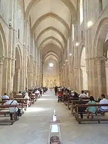 Se trata de un espacio típicamente cisterciense, de gran austeridad y magnificencia. La piedra se muestra desnuda excepto aquellos tramos de bóveda en los que el enlucido oculta la crucería. La estructura de la iglesia, construida enteramente en travertino, es de planta de cruz latina, tres naves, y siete tramos de bóveda de crucería hasta el transepto, tras el cual se prolonga un único tramo, que es un ábside cuadrangular. El transepto se compone de dos tramos longitudinales, siendo uno de ellos propiamente dos pares de capillas separadas por muros maestros, que flanquean el tramo del presbiterio. El tramo principal del transepto se compone de otros dos pares de tramos transversales y sobre el tramo central se eleva un cimborrio octagonal, de dos pisos de altura y culminado por una linterna. En el extremo sur del transepto, unas escaleras comunican el dormitorio con el templo. La nave central es el doble de alta que las laterales. En su piso superior se abren en el centro de cada tramo unos estrechos ventanales de arco de medio punto y una sencilla cornisa separa visualmente ambas alturas. Durante una restauración a comienzos del siglo XXI se instaló un nuevo pavimento.