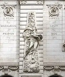 Figuras alegóricas de la Ciencia y las Artes sustentando a la villa de Toulouse. Relieve esculpido en la fachada del Museo de los Agustinos.